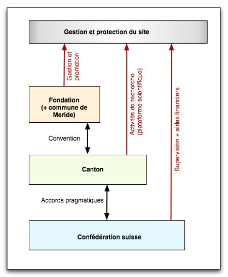 Le Canton du Tessin veille sur la poursuite des objectifs stratégiques définis dans les accords pragmatiques relatifs au site registré dans le patrimoine mondiale du Monte San Giorgio. De plus, il garanti l’intégration de la valeur universelle exceptionnelle du site dans la planification cantonale (garantie territoriale). Les rapports entre le Canton, la Fondation du Monte San Giorgio et la commune de Meride (propriétaire du bâtiment du Musée des fossiles du Monte San Giorgio) sont réglés par une Convention spécifique lesquels contenus sont résumés dans le schéma suivant: